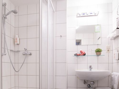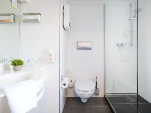 Dusche, WC, Handtücher, Kosmetikspiegel,