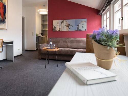 Sessel, Tisch + Stühle, Schreibtisch, integrierte Kochnische, Ganzkörperspiegel, Sitzecke,