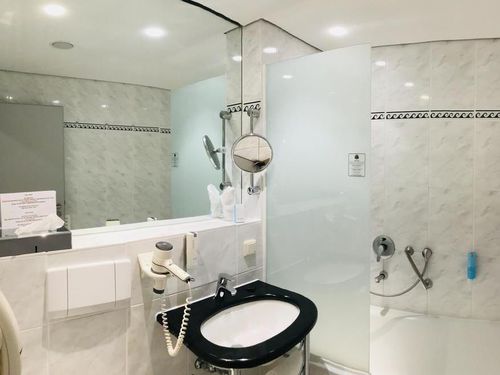 Dusche, Badewanne, WC, Handtücher, Spiegel, Kosmetikspiegel, Handtuchtrockner,