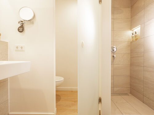 Dusche, WC, Handtücher, Spiegel, Kosmetikspiegel, Bademantel,