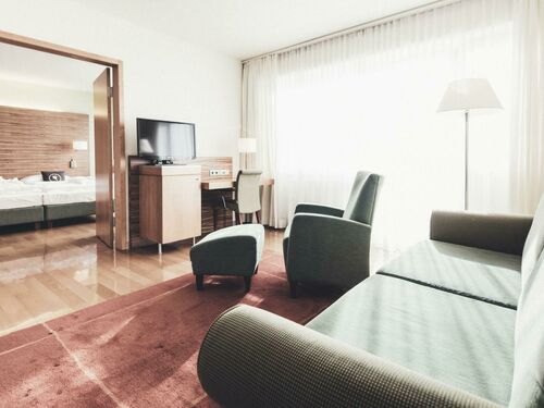 Aufbettung möglich, behindertenfreundlich, getrennte Betten, Couch, Tisch + Stühle, Schreibtisch, Minibar, Zimmersafe, Ganzkörperspiegel,