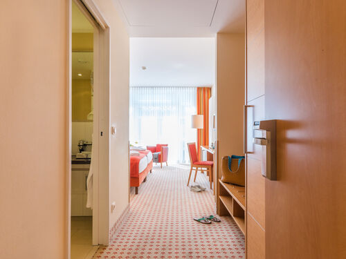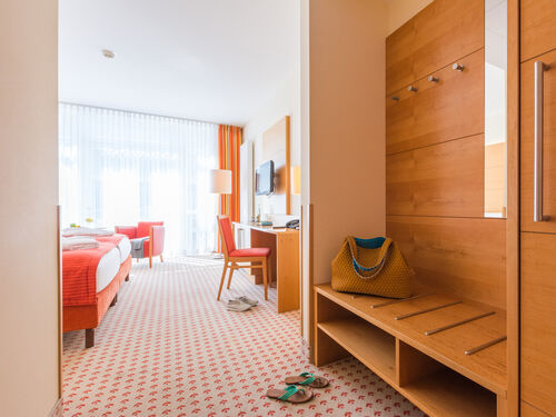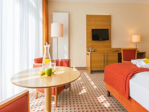 Sessel, Tisch + Stühle, Schreibtisch, Minibar, Zimmersafe,