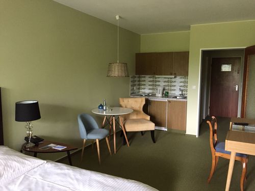 Sessel, Tisch + Stühle, Schreibtisch, Zimmersafe, integrierte Kochnische, Ganzkörperspiegel, Sitzecke,
