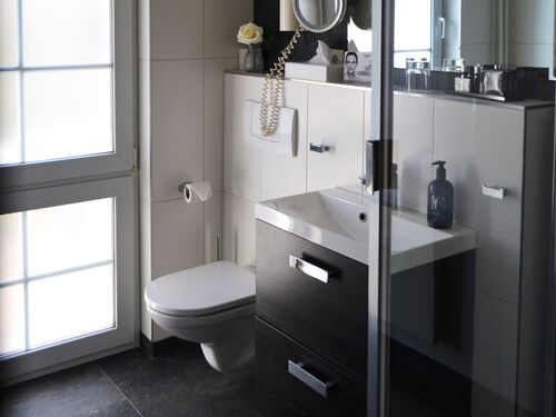 Dusche, WC, Handtücher, Haartrockner, Spiegel, Kosmetikspiegel, mit Fenster,