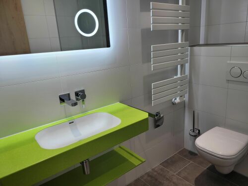 Dusche, WC, Handtücher, Spiegel, Handtuchtrockner,