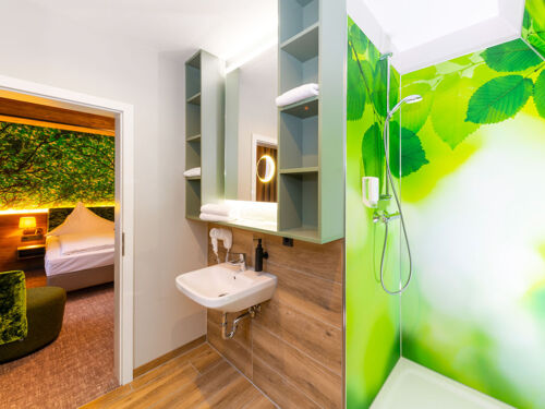 Saunaraum mit Fenster und Blick ins Grüne - lassen Sie einfach die Seele baumeln. Wer die große Hitze nicht so mag, kann sich in der Infrarotsauna sanft aufwärmen. Aus der Saunakammer raus geht's erst mal unter die Dusche und dann ab ins Freie.