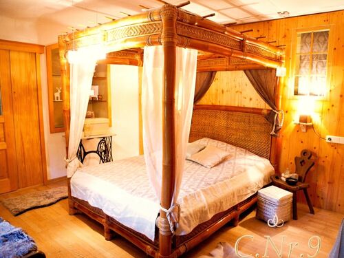 Das kleine 2 Zimmer Familienapartment im ersten Stock mit Balkonzugang hat eine Größe von ca. 45 m² und ist geeignet für 2 -3 Personen. Ausgestattet mit einem kleinen ,edlen, gemütlichen Badezimmer mit Englischer Badewanne, romantischem Elektrokamin, Himmelbett, einem kleinem Kinder Hochbett, einer Schlafcouch, begehbarem Schrank und einer Kochnische zum Herrichten von kleinen Speisen, ist es sowohl als romantisches Dominzil als auch als Feriennest geeignet.