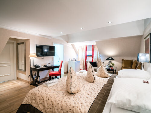 Kinderbett zustellbar, Anzahl Doppelbett/en, Anzahl Einzelbett/en, Babybett zustellbar, Sessel, Couch, Tisch + Stühle, Schreibtisch, Minibar, Zimmersafe, Sitzecke,