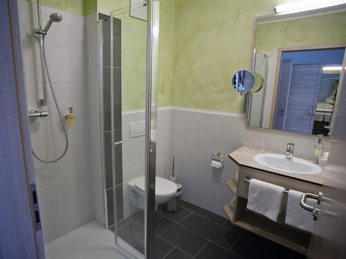 Dusche, WC, Handtücher, Haartrockner, Spiegel, Kosmetikspiegel, Bademantel,