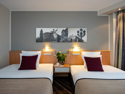 Telefon, Klimaanlage, Wecker, Lärmschutzfenster, separate Kofferablage, Rauchmelder, Fluchtwegkarte, Nichtraucherzimmer, W-LAN (kostenfrei), TV inkl. Radio,