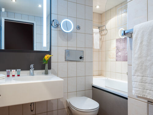 Dusche, Badewanne, WC, Handtücher, Haartrockner, Spiegel, Kosmetikspiegel,