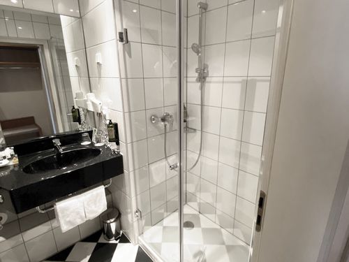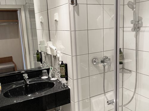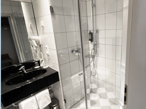 Dusche, Badewanne, WC, Handtücher, Haartrockner, Spiegel, Kosmetikspiegel, Bademantel,