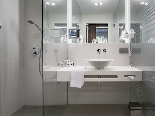 Dusche, WC, Handtücher, Haartrockner, Spiegel, Kosmetikspiegel, Bademantel,