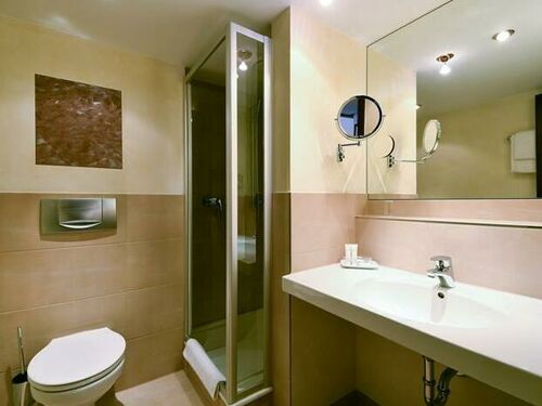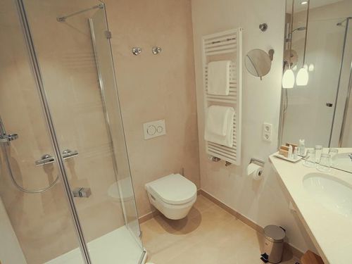 Dusche, Badewanne, WC, Handtücher, Spiegel, Kosmetikspiegel, Bademantel,