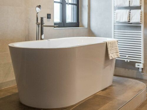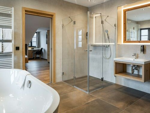 Dusche, Badewanne, WC, Spiegel, Handtuchtrockner, mit Fenster,
