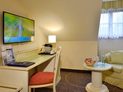 - Übernachten in eleganten, klimatisierten Zimmern mit Smart-TV, SKY Sport & Film, Erb-Signature Boxspringbetten und viel Ruhe dank Schallschutz.