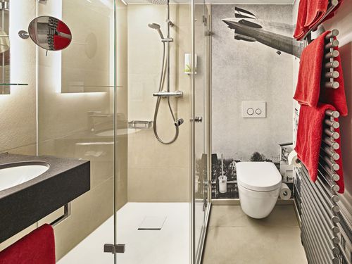 Dusche, WC, Handtücher, Spiegel, Kosmetikspiegel, Bademantel,