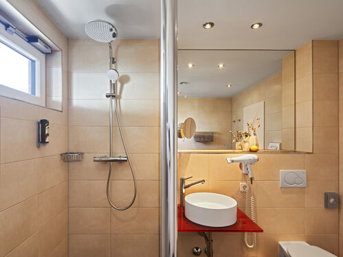 Dusche, WC, Handtücher, Spiegel, Kosmetikspiegel, Bademantel, mit Fenster,